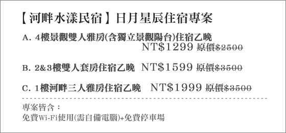 商品訊息簡述: 只要1299元起即可享【河畔水漾民宿】原價最高3500元日月星辰住宿專案:(A)4樓景觀雙人雅房(含獨立景觀陽台)住宿乙晚/(B)2&3樓雙人套房住宿乙晚/(C)1樓河畔三人雅房住宿乙晚,專案皆含免費Wi-Fi使用(需自備電腦)+免費停車場!